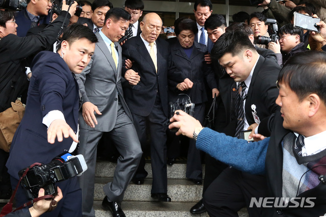 【광주=뉴시스】류형근 기자 = 고(故) 조비오 신부 사자명예훼손 혐의를 받고 있는 전두환 전 대통령이 11일 오후 광주지방법원에서 열린 재판을 마친 뒤 귀가하고 있다. 2019.03.11.