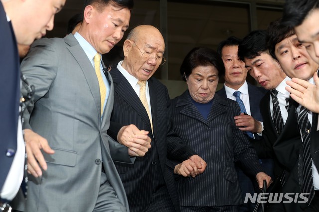 【광주=뉴시스】류형근 기자 = 고(故) 조비오 신부 사자명예훼손 혐의를 받고 있는 전두환 전 대통령이 11일 오후 광주지방법원에서 열린 재판을 마친 뒤 이순자 여사와 귀가하고 있다. 2019.03.11.