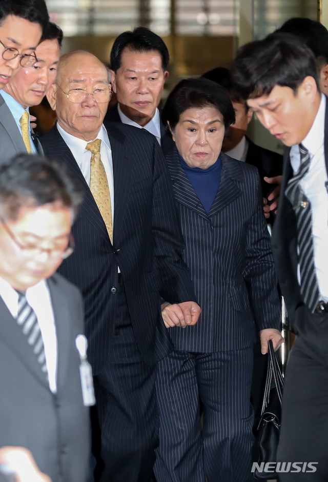 【광주=뉴시스】류형근 기자 = 전두환 전 대통령이 11일 광주지법에서 재판을 마치고 부인 이순자씨와 손을 꼭 잡은채 법원을 빠져 나가고 있다. 2019.03.11.