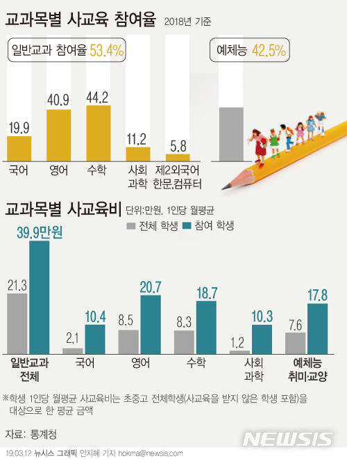 [그래픽]과목별 사교육 참여율…일반교과 53.4%, 예체능 42.5%