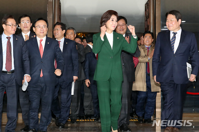 【서울=뉴시스】이종철 기자  = 자유한국당 나경원 원내대표가 12일 서울 여의도 국회에서 교섭단체 대표연설을 마치고 본회의장을 나서면서 나경원을 연호하는 소리에 두 손을 들고 포즈를 취하고 있다. 2019.03.12.