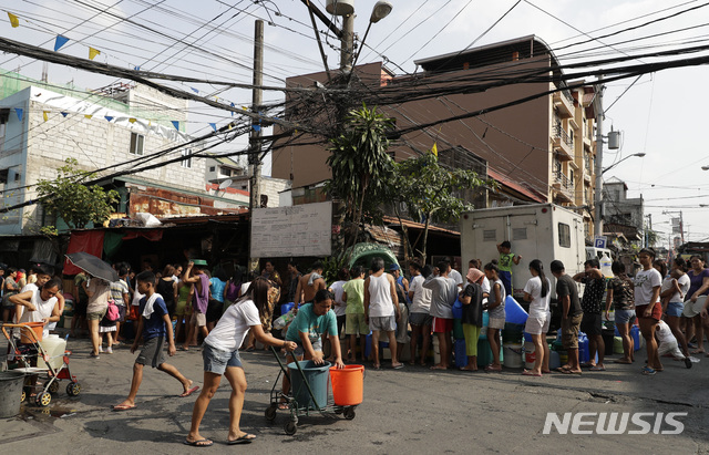 【마닐라=AP/뉴시스】13일(현지시간) 필리핀 마닐라 만달루용 거리에 물통을 든 주민들이 물을 받기 위해 줄 서 있다.
