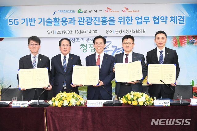 【문경=뉴시스】김진호 기자 = 경북 문경시는 13일 시청 회의실에서 SK텔레콤, SK브로드밴드와 첨단 정보통신기술을 활용한 관광자원 개발 및 사회적 가치를 창출하기 위한 업무협약을 체결했다. 왼쪽부터 이상열 문경관광진흥공단 이사장, 김인호 문경시의회 의장, 고윤환 문경시장, 김기선 SKT 동부인프라본부장, 류형석 SKB본부장. 2019.03.13 (사진=문경시 제공)