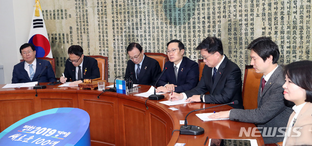 【서울=뉴시스】박영태 기자 = 13일 오전 서울 영등포구 여의도 국회에서 열린 더불어민주당 최고위원회의에서 홍영표 원내대표가 발언하고 있다. 2019.03.13.