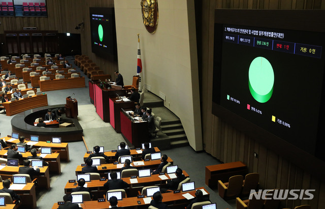 【서울=뉴시스】홍효식 기자 = 13일 오전 서울 여의도 국회에서 열린 본회의에서 액화석유가스의 안전관리 및 사업법 일부개정법률안이 재석 237인 중 찬성 236인, 반대 1인으로 통과되고 있다. 2019.03.13.