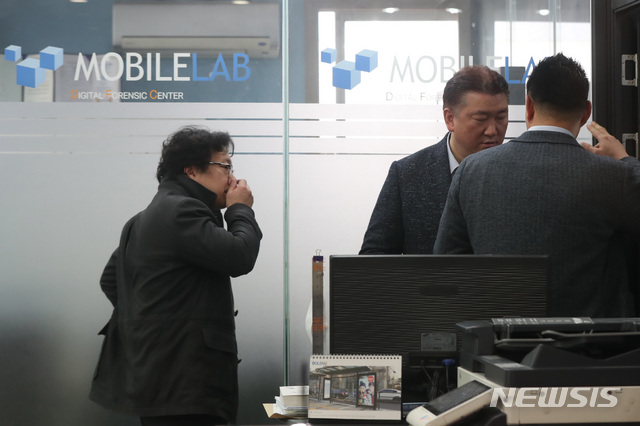 【서울=뉴시스】이윤청 수습기자 = 카카오톡 단체대화방을 통해 불법 촬영한 성관계 동영상을 유포한 의혹을 받는 정준영씨가 휴대전화를 맡겼던 서울 서초구의 한 휴대전화 복원 사설업체를 13일 서울지방경찰청 광역수사대가 압수수색하고 있다. 2019.03.13.