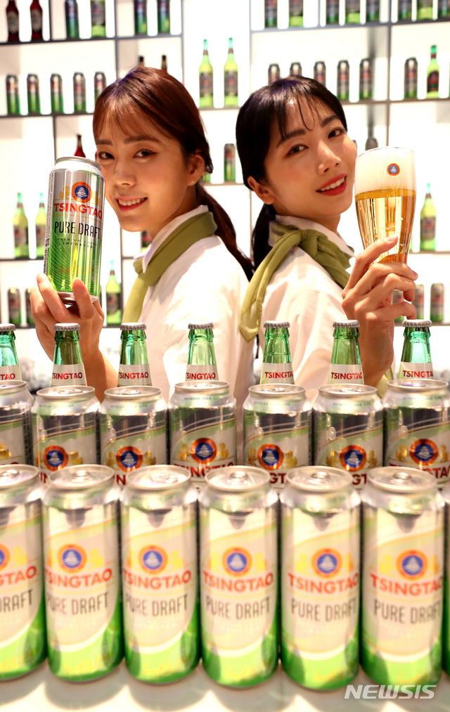 【서울=뉴시스】 전진환 기자 = 13일 오후 서울 중구 명동의 한 호텔에서 모델들이 글로벌 프리미엄 맥주 칭따오가 새롭게 선보인 '칭따오 퓨어 드래프트(생)'을 소개하고 있다.