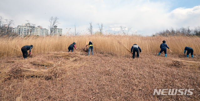 【대구=뉴시스】우종록 기자 = 찬바람 불며 쌀쌀한 꽃샘추위가 찾아온 13일 오후 대구 동구 율하동 안심율하체육공원에서 공공근로자 및 공원관계자들이 무성한 억새풀을 정리하고 있다. 2019.03.13.