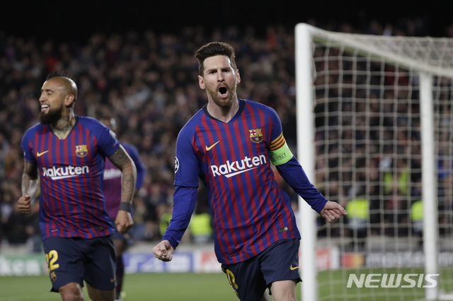 【바르셀로나=AP/뉴시스】FC 바르셀로나의 리오넬 메시가 13일(현지시간) 스페인 바르셀로나 캄노우에서 열린 리옹과의 2018-2019 UEFA 챔피언스리그 16강 2차전에서 팀의 세 번째 골을 넣고 환호하고 있다.