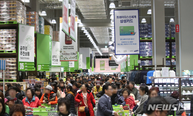 【서울=뉴시스】김선웅 기자 = 창고형 할인점 이마트 트레이더스가 14일 서울 노원구 월계동에 서울 첫 점포인 월계점을 개점했다. 매장 면적은 9917㎡(3000평), 연면적은 축구장 6.5배 크기인 4만5302㎡(1만3704평) 규모다. 이날 이마트 트레이더스 월계점의 모습. 2019.03.14.