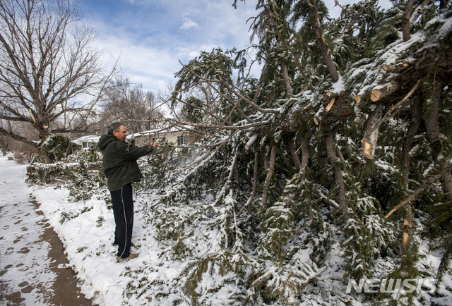 【콜로라도스프링스=AP/뉴시스】14일(현지시간) '폭탄 사이클론'이 강타한 미 콜로라도주 콜로라도스프링스에서 한 남성이 자신의 집 앞에 쓰러진 나무를 가리키고 있다.