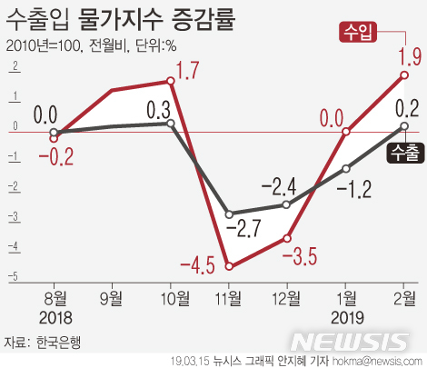 【서울=뉴시스】한국은행이 15일 발표한 '2월 수출입물가지수'에 따르면 지난달 수출물가는 원화기준 82.97(2010년=100기준)로 전월보다 0.2% 상승했다. (그래픽=안지혜 기자)