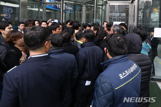 【서울=뉴시스】박미소 수습기자 = 포스코 주주총회가 열린 15일 오전 서울 강남구 포스코센터 앞에서 금속노조 포스코지회 노조원들이 본사 안으로 들어가려 하자 경비인력들에게 제지당하고 있다. 2019.03.15.