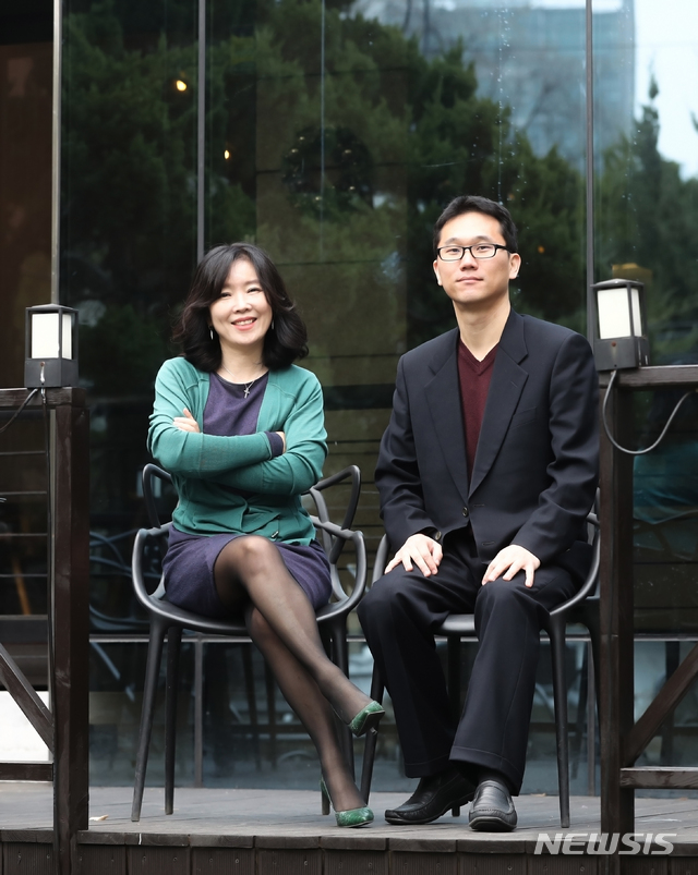 【서울=뉴시스】조수정 기자 = 여성 독립운동가들의 이야기를 다룬 다큐멘터리 영화 '1919 유관순' 이은혜(왼쪽) 작가와 박상현 프로듀서가 15일 오전 서울 종로구 신문로 카페에서 뉴시스와 인터뷰에 앞서 포즈를 취하고 있다. 이은혜 작가는 유관순문화산업전문 대표를, 박상현 프로듀서는 제작이사를 맡고 있다. 2019.03.16. [email protected]