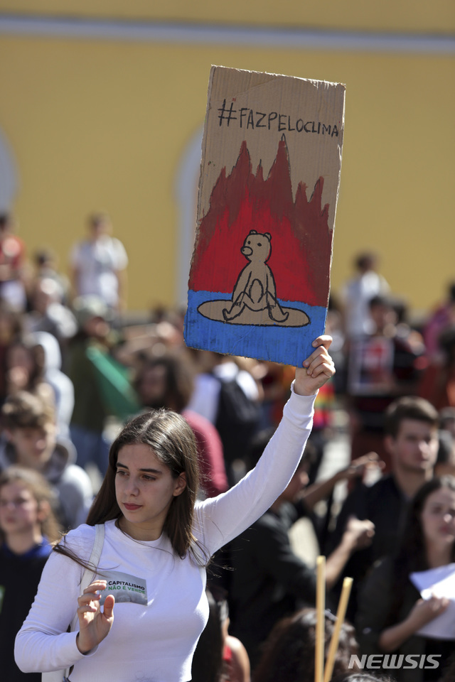 【리스본=AP/뉴시스】15일(현지시간) 포르투갈 수도 리스본에서 열린 기후변화 대책마련 시위에서 한 소녀가 지구온난화 대책을 요구하는 포스터를 치켜들고 있다. 이날 포르투갈을 비롯해 프랑스, 오스트리아, 폴란드, 인도 등 전세계 각국에서 기후변화 대책 마련을 촉구하는 학생들의 시위가 열렸다. 2019.03.16.