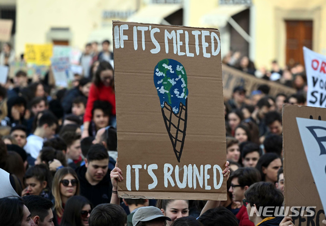 【플로렌스=AP/뉴시스】15일(현지시간) 이탈리아 플로렌스에서 학생들이 기후변화 대응을 촉구하며 시위를 진행하고 있다. 이날 이탈리아뿐만 아니라 프랑스, 오스트리아, 폴란드, 스페인 등 전세계 각국에서 기후변화 대책 마련을 촉구하는 학생들의 시위가 열렸다. 2019.03.16.
