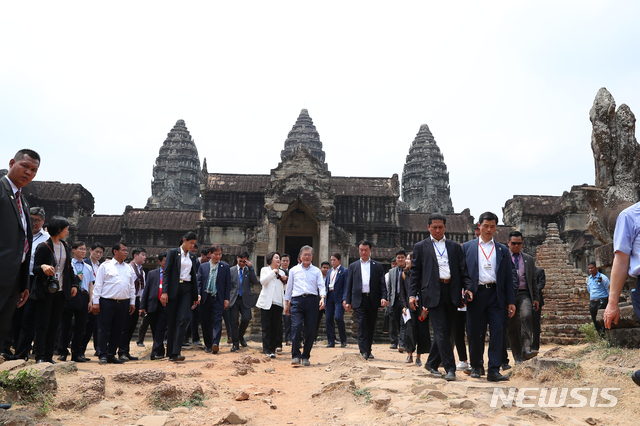 【시엠립(캄보디아)=뉴시스】전신 기자 = 캄보디아를 국빈 방문 중인 문재인 대통령과 부인 김정숙 여사가 16일 시엠립 앙코르와트를 시찰하고 있다. 2019.03.16.