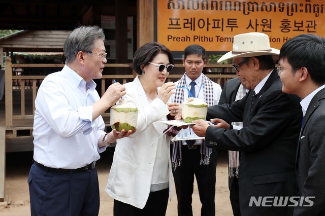 【시엠립(캄보디아)=뉴시스】전신 기자 = 문재인 대통령과 김정숙 여사가 16일 오후(현지시간) 캄보디아 시엠립 프레아피투 사원을 둘러본 후 콩솜올 부총리 겸 왕실부장관으로부터 야자열매음료를 받고 있다. 2019.03.16.