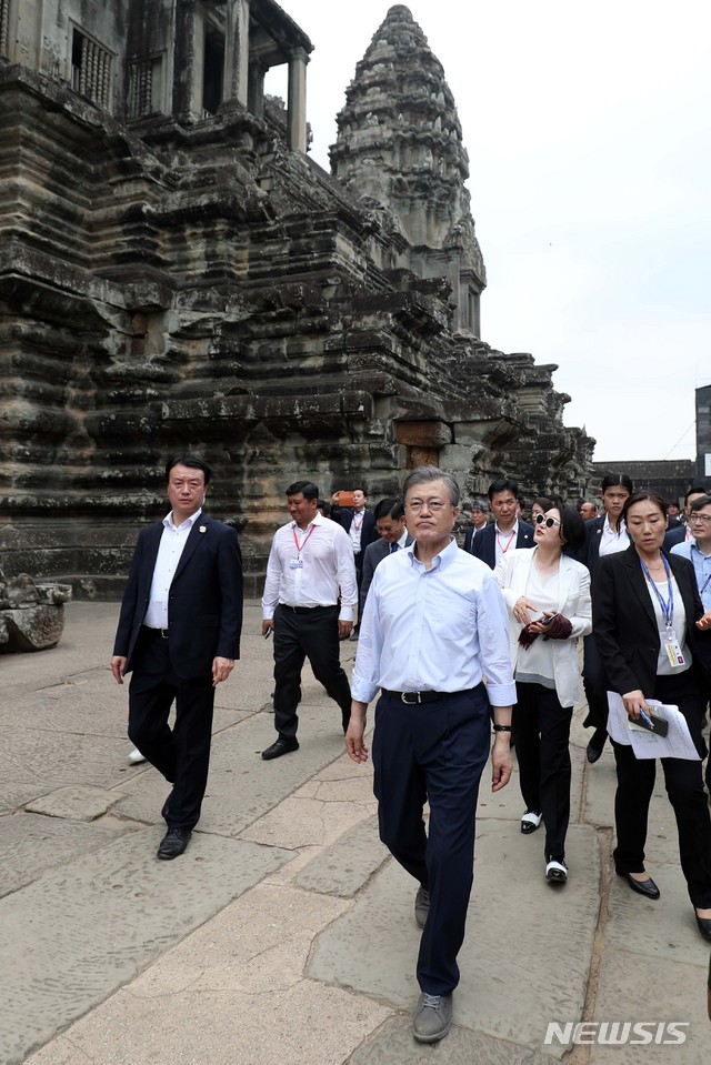 【시엠립(캄보디아)=뉴시스】전신 기자 = 캄보디아를 국빈 방문 중인 문재인 대통령과 부인 김정숙 여사가 16일 시엠립 앙코르와트를 시찰하고 있다. 2019.03.16.