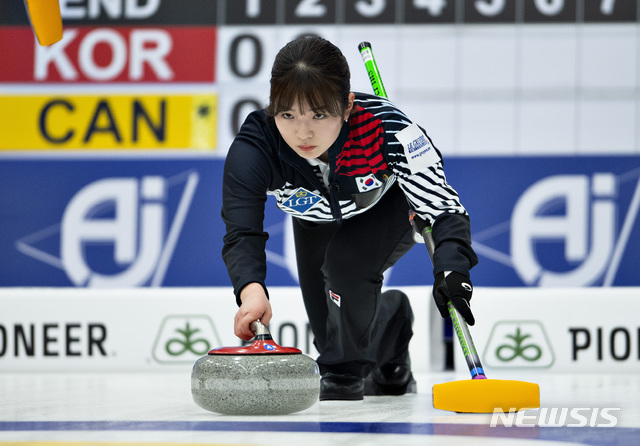 【실케보르(덴마크)=AP/뉴시스】여자컬링 대표팀(춘천시청)이 16일(현지시간) 덴마크 실케보르에서 열린 '2019 세계 여자컬링 선수권대회' 예선 1차전에서 캐나다를 상대로 경기하고 있다.