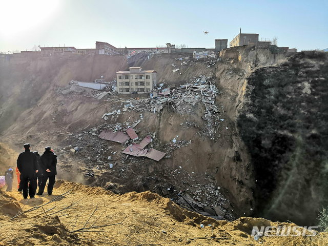 【린펀(중국)=AP/뉴시스】15일(현지시간) 중국 산시성 린펀시 샹닝현에서 일어난 산사태로 건물이 무너져 16일 구조대가 현장을 살피고 있다.