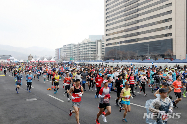 【서울=뉴시스】김병문 수습기자 = 17일 오전 서울 종로구 광화문광장에서 열린 서울국제마라톤대회 참가자들이 힘차게 출발을 하고 있다 2019.03.17.