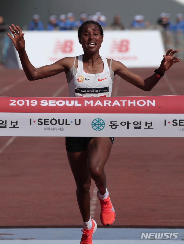 이날 마라톤 대회에서 케냐의 토마스 키플라갓 로노선수가 2시간 06분의 기록으로 남자 엘리트 부분에서, 바레인의 데시지사 모코닌 선수가 2시간 23분 44초로 남여 엘리트부분 우승을 차지 했으며 한국 전력공사 소속의 심종섭 선수가 2시간 12분 57초 SH서울주택도시공사 소속의 안슬기 선수가 2시간 27분 28초의 기록으로 남녀 엘리트 국내 1위를 차지 했다. 2019.03.17. (사진=동아일보 제공)