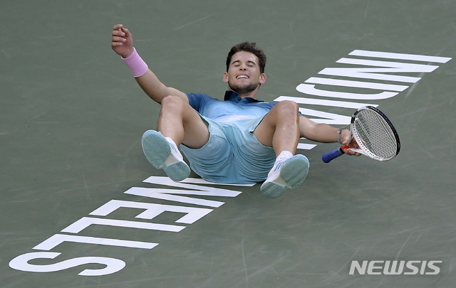 【인디언웰스=AP/뉴시스】도미니크 팀(8위,오스트리아)이 17일(현지시간) 미 캘리포니아주 인디언웰스에서 열린 남자프로테니스(ATP) 투어 BNP 파리바오픈 남자단식 결승에서 로저 페더러(4위,스위스)를 물리치고 코트에 누워 환호하고 있다.