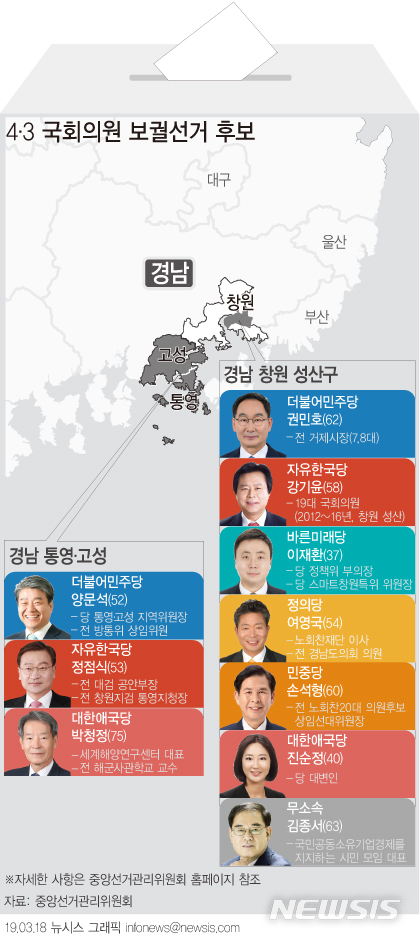 【서울=뉴시스】'4월3일 국회의원 보궐선거' 후보등록 결과, 노회찬 정의당 의원의 별세로 치러지는 창원성산 선거구에는 7명이 등록했다. 이군현 자유한국당 의원의 의원직 상실(장치자금법 위반)로 치러지는 통영·고성 선거구는 3명이 출마했다. (그래픽= 안지혜 기자)
