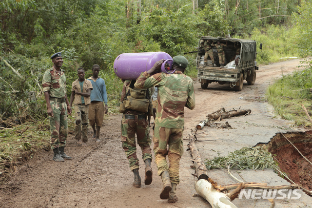 【치마니마니(짐바브웨)=AP/뉴시스】18일(현지시간) 짐바브웨 수도 하라레 남동부 치마니마니 마을에서 군인들이 사이클론 피해 지역으로 구호물품을 수송하고 있다.