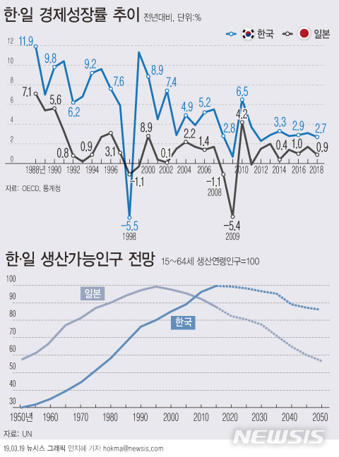 【서울=뉴시스】 2012년 이후 일본의 경제성장률은 2013년 2.0%를 기록, 한 차례 2%대를 회복한 뒤 2018년까지 0~1%대를 횡보했다. (그래픽=안지혜 기자)