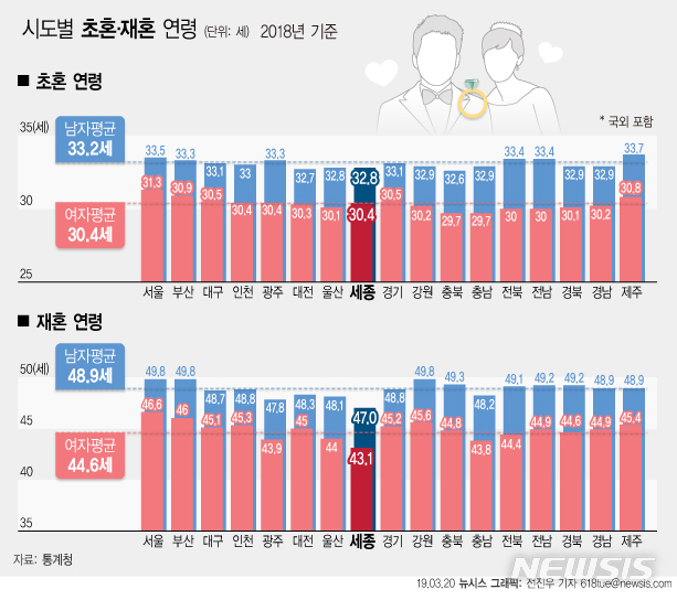 【서울=뉴시스】통계청에 따르면 인구 1000명당 혼인 건수를 뜻하는 '조혼인율'을 시·도별로 집계한 결과 6.9건을 기록한 세종이 1위를 차지했다. 세종 평균 초혼연령을 보면 남성은 32.8세로 전국 평균 33.2세보다 0.4세 어렸다. (그래픽=전진우 기자)