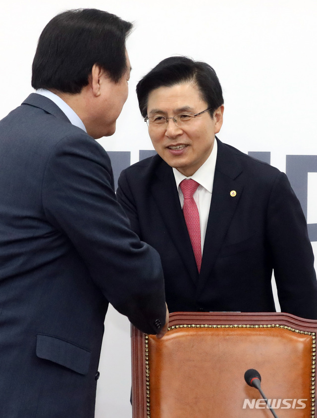 【서울=뉴시스】박영태 기자 = 20일 오전 서울 영등포구 여의도 국회에서 열린 자유한국당 당대표 및 최고위원-중진의원 선거대책회의에서 황교안 대표가 김무성 의원과 인사를 나누고 있다. 2019.03.20.