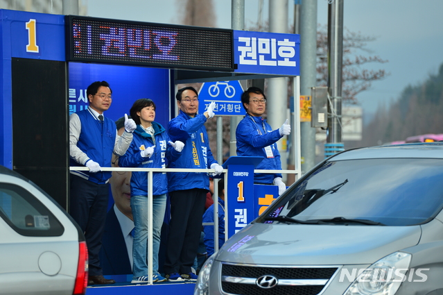 【창원=뉴시스】강경국 기자 = 4·3 국회의원 보궐선거 공식선거운동 첫 날인 21일 경남 창원시 성산구 창원병원 사거리에서 민주당 권민호(차량 위 오른쪽 두번째) 후보가 선거차량에서 선거운동원들과 함께 유세를 펼치고 있다. 2019.03.21.