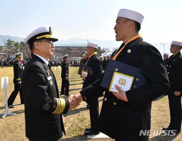 【창원=뉴시스】강경국 기자 = 22일 해군사령부 연병장에서 해군병 655기 정모수여 및 수료식이 열린 가운데 해군 교육사령관 이성환 중장이 훈련을 수료한 해군병과 악수를 하고 있다. 2019.03.22. (사진=해군 교육사령부 제공)