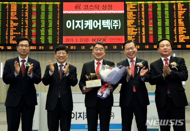 【서울=뉴시스】한국거래소 코스닥시장본부는 22일 오전 서울 여의도 한국거래소 서울사옥 홍보관에서 의료정보시스템 업체인 이지케어텍의 코스닥 시장 신규상장 기념식을 개최했다.
