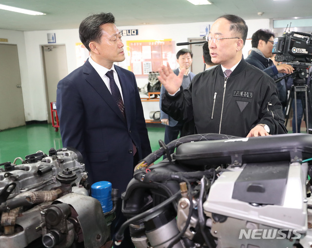 【부천=뉴시스】 전진환 기자 = 홍남기 경제부총리 겸 기획재정부장관이 22일 오전 제13차 현장방문·소통라운드테이블의 일환으로 경기도 부천시 부천직업전문학교를 방문해 김영규 이사장과 대화하고 있다. 2019.03.22.