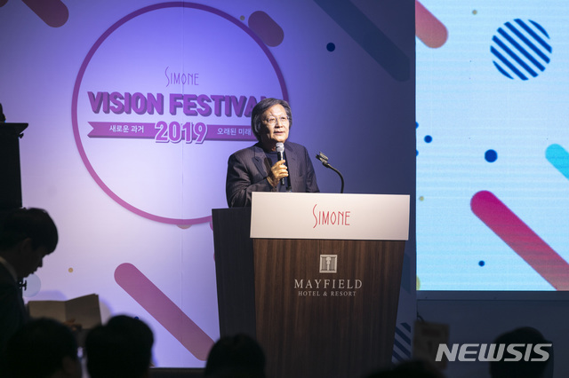 【서울=뉴시스】이영환 기자 = 22일 서울 강서구 메이필드 호텔에서 열린 '2019 시몬느 비전 페스티벌(SIMONE VISION FESTIVAL)'에서 박은관 시몬느 회장이 '새로운 과거, 오래된 미래'를 주제로 기념사를 하고 있다. 2019.03.22.(사진=시몬느 제공)