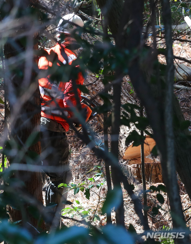 【제주=뉴시스】우장호 기자 = 23일 오전 환경단체 반대와 경관 훼손 논란 등으로 중단됐던 제주시 구좌읍 비자림로 확장공사가 7개월만에 재개된 가운데 현장에서 벌목 작업이 이뤄지고 있다. 2019.03.23.