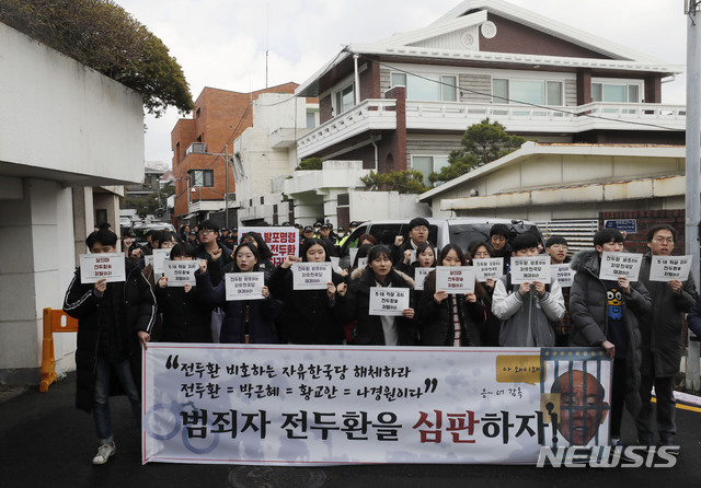 【서울=뉴시스】최동준 기자 = 한국대학생진보연합이 23일 서울 연희동 전두환 씨 자택 앞에서 기자회견을 열고 5.18 사죄와 처벌을 촉구하고 있다. 2019.03.23.