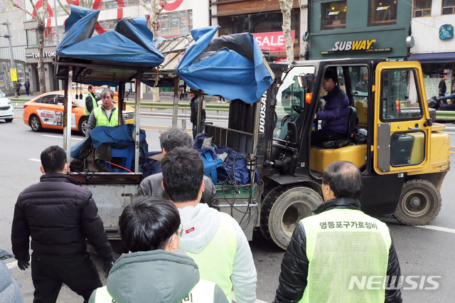 【서울=뉴시스】이윤청 수습기자 = 25일 서울 영등포구 영중로 일대에서 영등포구청 관계자들이 거리가게 행정대집행(철거)을 실시하고 있다.