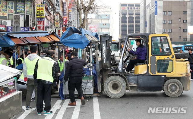 【서울=뉴시스】이윤청 수습기자 = 25일 서울 영등포구 영중로 일대에서 영등포구청 관계자들이 거리가게 행정대집행(철거)을 실시하고 있다.