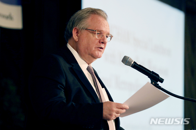 【서울=뉴시스】김병문 수습기자 = 제프리 존스 주한미국상공회의소 이사장이 25일 오후 서울 중구 포시즌스호텔에서 열린 '주한미국상공회의소 오찬 간담회'에 참석해 모두발언을 하고 있다. 2019.03.25.