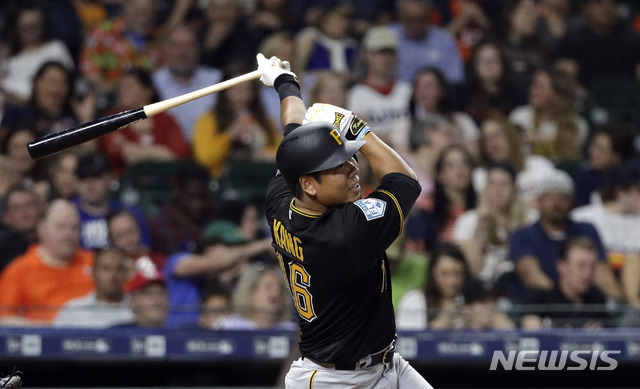 【휴스턴=AP/뉴시스】피츠버그 파이어리츠의 강정호가 25일(현지시간) 미 텍사스주 휴스턴의 미닛메이드 파크에서 열린 2019 메이저리그 휴스턴 애스트로스와의 시범 경기에서 안타를 치고 있다. 강정호는 홈런 7개를 치며 시범경기 홈런 1위를 기록하고 있다. 2019.03.26.