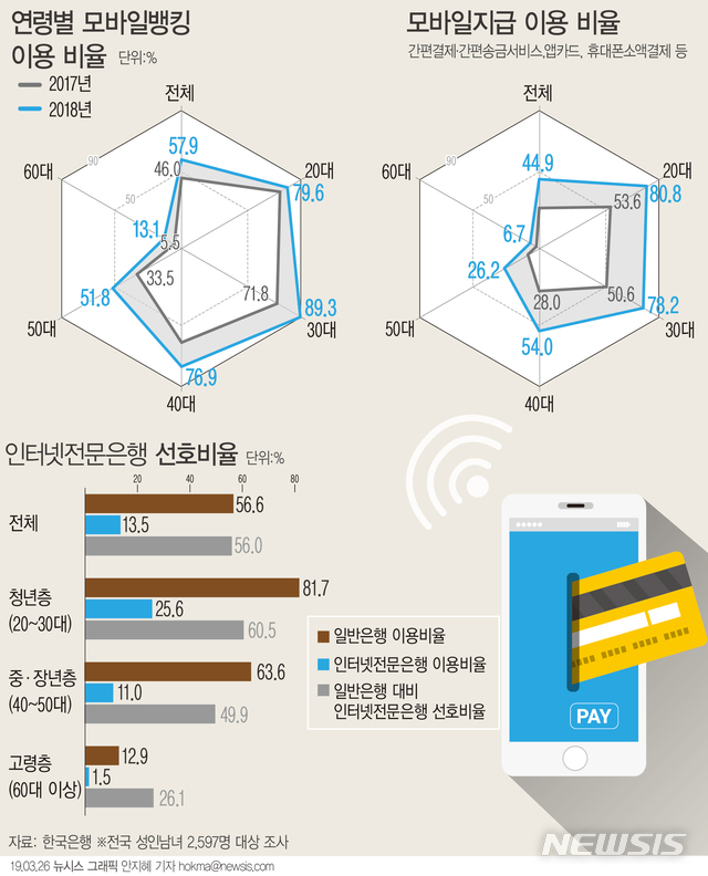 【서울=뉴시스】26일 한국은행이 발표한 '2018년도 지급결제보고서'에 따르면 지난해 9월말 기준 모바일뱅킹의 일평균 이용금액은 5조2000억원으로 집계됐다. 한국은행이 전국 성인남녀 2597명을 대상으로 '모바일 금융서비스 이용행태' 조사를 실시한 결과 연령대가 낮을수록 이용 비율이 높게 나타났다. (그래픽=안지혜 기자)