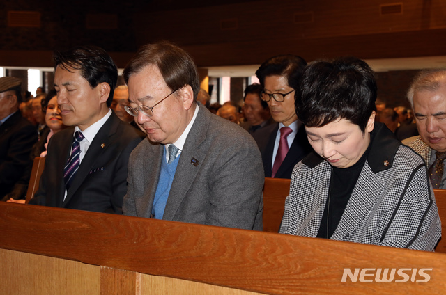 【서울=뉴시스】고승민 기자 = 26일 서울 정동제일교회에서 열린 이승만 전 대통령 144주년 기념식에서 자유한국당 김진태, 강효상 의원, 바른미래당 이언주 의원, 김문수 전 경기도지사가 참석해 기도하고 있다. 2019.03.26.