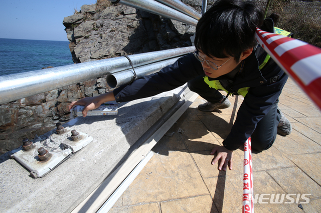【강릉=뉴시스】김경목 기자 = 26일 오후 도로교통공단 관계자가 19살 동갑내기 5명(남성 3명, 여성 2명)이 카셰어링 코나 SUV승용차를 타고 가다 난간을 들이받고 바다에 추락해 숨진 강원 강릉시 옥계면 금진리 헌화로 사고 현장에서 추락 지점을 페인트로 표시를 하고 있다. 2019.03.26.