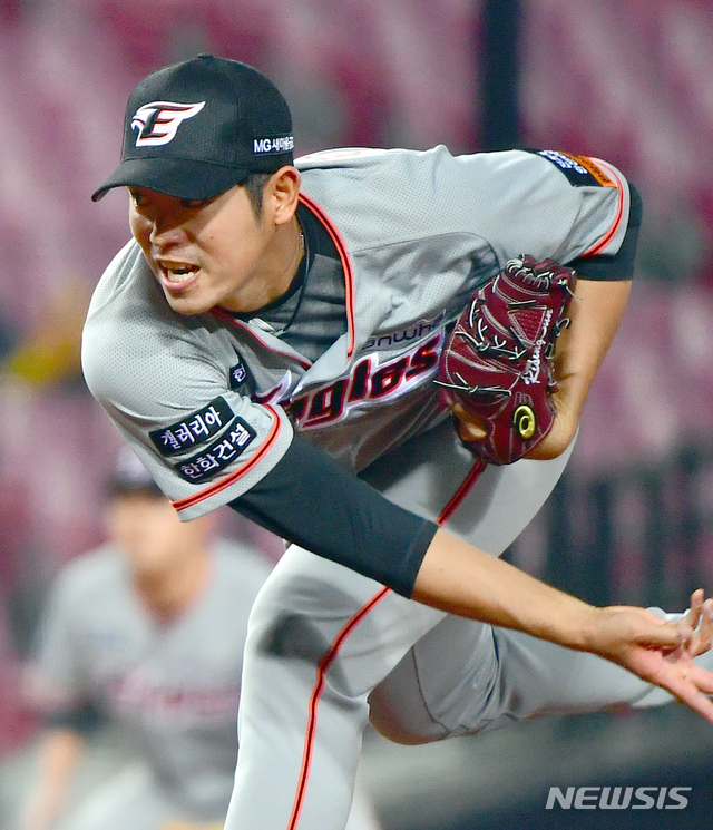 【광주=뉴시스】류형근 기자 = 26일 오후 광주 북구 광주-기아챔피언스필드에서 열린 2019프로야구 KIA 타이거즈 대 한화 이글스의 경기, 9회말 무사에서 마운드에 오른 한화 바뀐투수 이태양이 역투하고 있다. 2019.03.26.