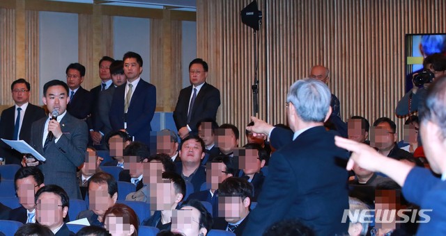 【서울=뉴시스】배훈식 기자 = 대한항공 주주 대리인으로 주주총회에 참석한 바른미래당 채이배 의원(왼쪽)이 27일 오전 서울 강서구 대한항공 본사에서 열린 정기 주주총회에서 조양호 한진그룹 회장의 사내이사 연임의 건 관련 발언을 하자 이에 반대하는 주주들이 삿대질을 하며 항의하고 있다. 2019.03.27.