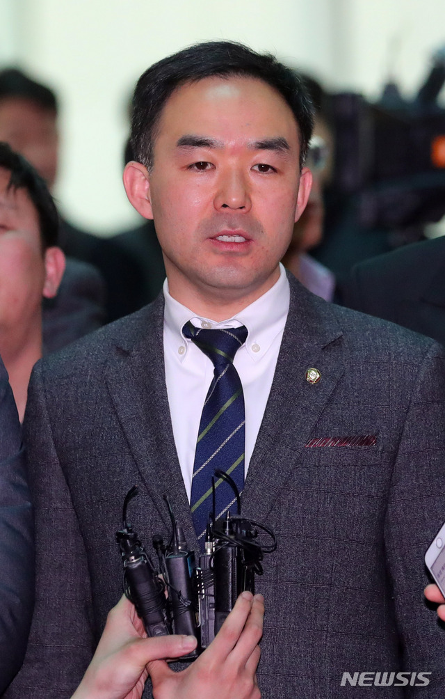 【서울=뉴시스】배훈식 기자 = 주주총회에서 조양호 한진그룹 회장의 대한항공 사내이사 연임안이 부결된 27일 오전 서울 강서구 대한항공 본사 주총장 앞에서 채이배 바른미래당 의원이 입장발표를 하고 있다. 2019.03.27.